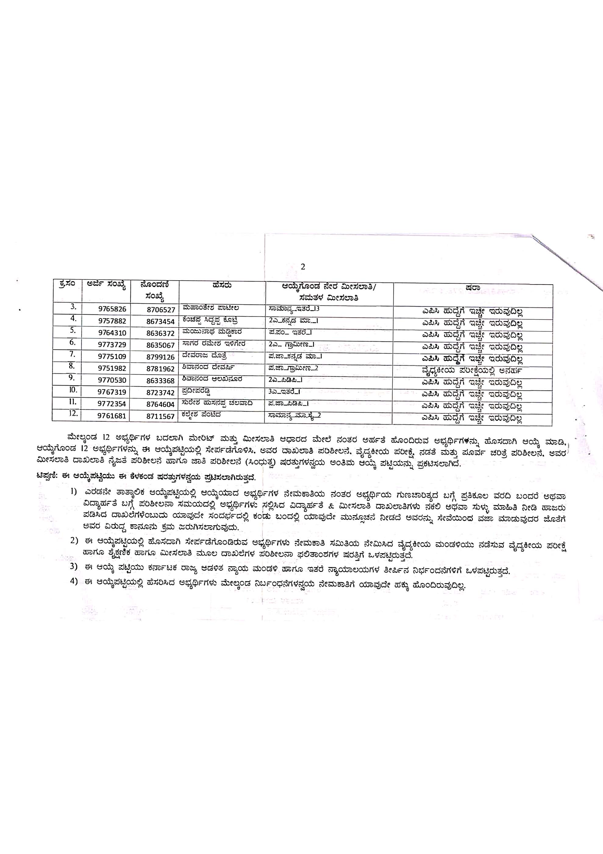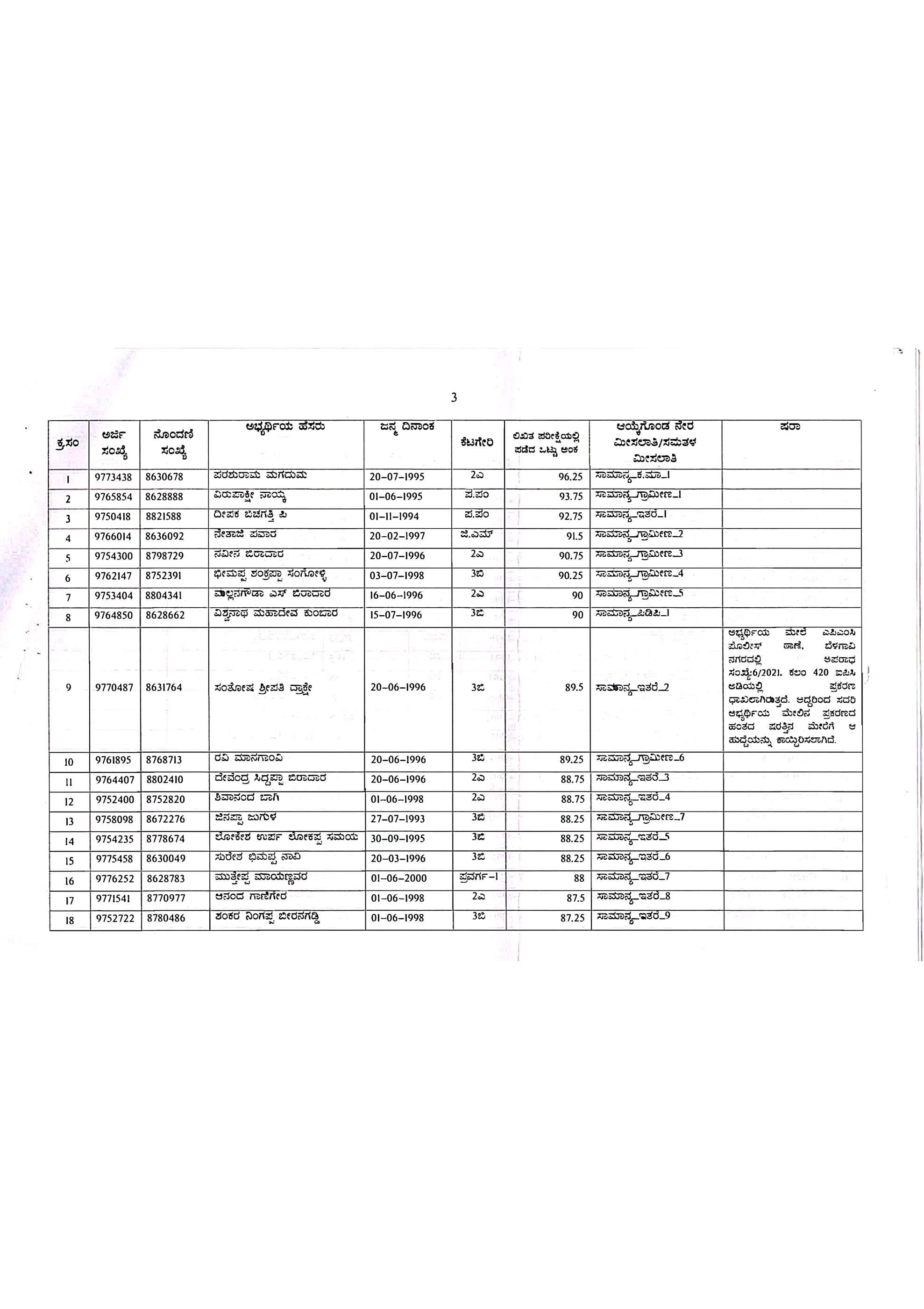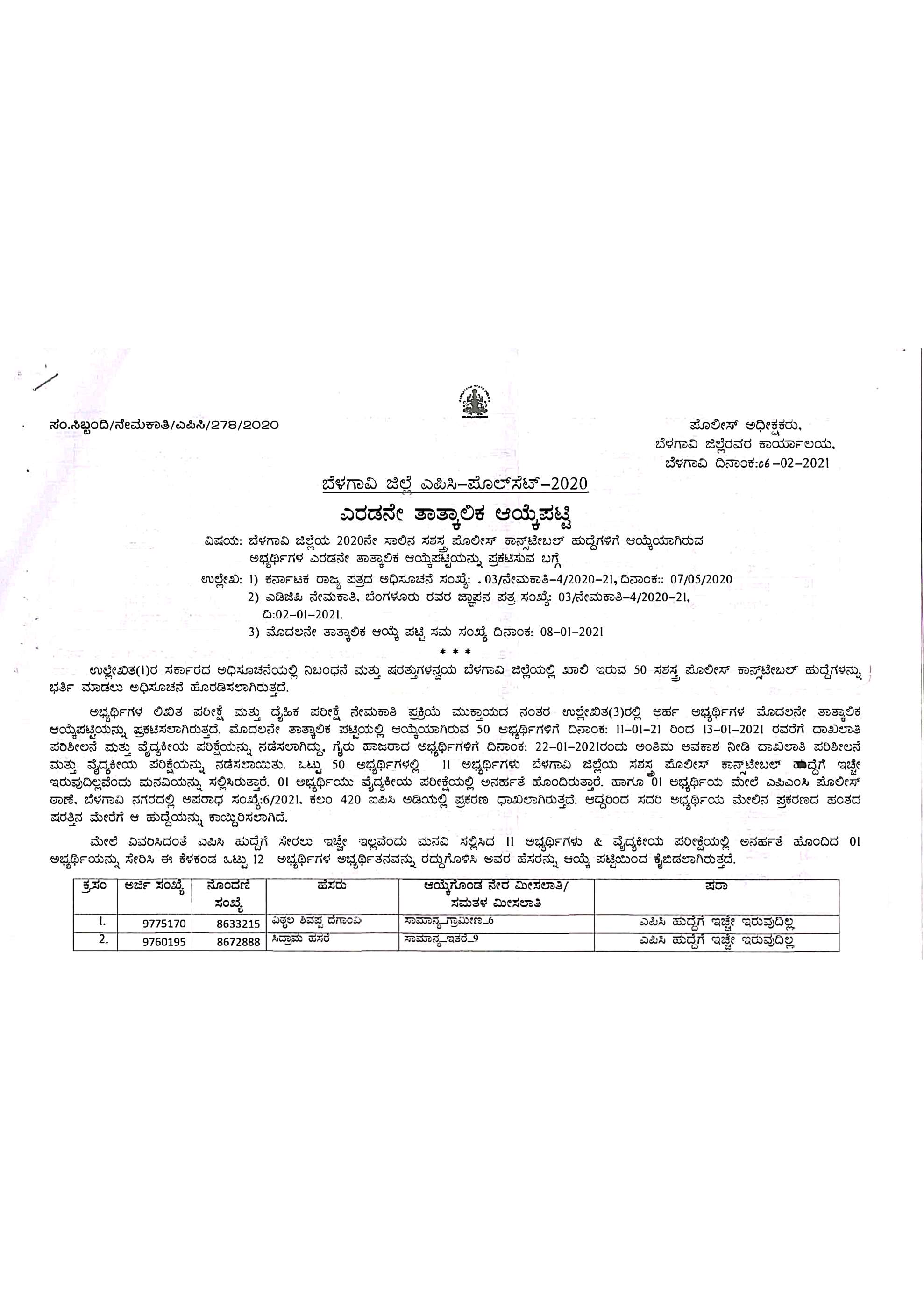 𝐏𝐂 (𝐃𝐀𝐑) 𝐏𝐑𝐎𝐕𝐈𝐒𝐈𝐎𝐍𝐀𝐋 𝐒𝐄𝐋𝐄𝐂𝐓𝐈𝐎𝐍 𝐋𝐈𝐒𝐓ಬೆಳಗಾವಿ ಜಿಲ್ಲಾ ಘಟಕದಲ್ಲಿನ 50 ಸಶಸ್ತ್ರ ಪೊಲೀಸ್ ಕಾನ್ಸ್ಟೇಬಲ್ ಹುದ್ದೆಗಳ ನೇಮಕಾತಿಗೆ ಸಂಬಂಧಿಸಿದಂತೆ ದ್ವಿತೀಯ ತಾತ್ಕಾಲಿಕ ಆಯ್ಕೆಪಟ್ಟಿ (2nd Provisional Selection List) ಯು ಇದೀಗ ಪ್ರಕಟಗೊಂಡಿದೆ.!!ಬೇರೆ ಬೇರೆ ಕಾರಣಗಳಿಂದಾಗಿ 12 ಅಭ್ಯರ್ಥಿಗಳ ಅಭ್ಯರ್ಥಿತ್ವವನ್ನು ರದ್ದುಗೊಳಿಸಿ ಇದೀಗ ಹೊಸದಾಗಿ ಆ 12 ಸ್ಥಾನಗಳಿಗೆ ಹೊಸ ಅಭ್ಯರ್ಥಿಗಳನ್ನು ಆಯ್ಕೆಮಾಡಿ 2ನೇ ತಾತ್ಕಾಲಿಕ ಆಯ್ಕೆಪಟ್ಟಿ ಪ್ರಕಟಿಸಲಾಗಿದೆ.!!
